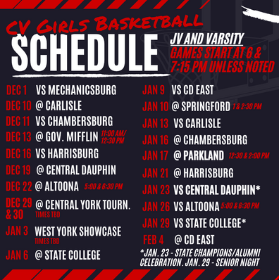 The CV Girls Basketball Booster Club was created to promote and support the Cumberland Valley Girls Basketball program. Through our fundraising efforts, we help offset costs that the school district’s budget does not cover. Your financial support enhances all levels of our basketball program - from middle school to Varsity.